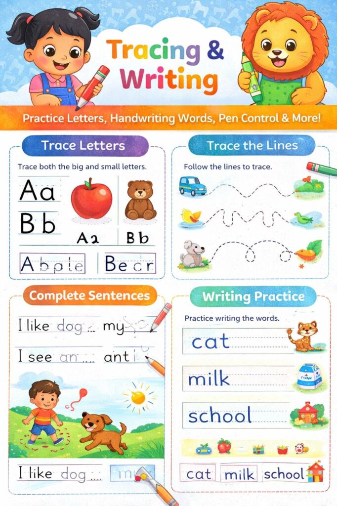 Alphabet tracing, number tracing, handwriting, and writing practice sheets.