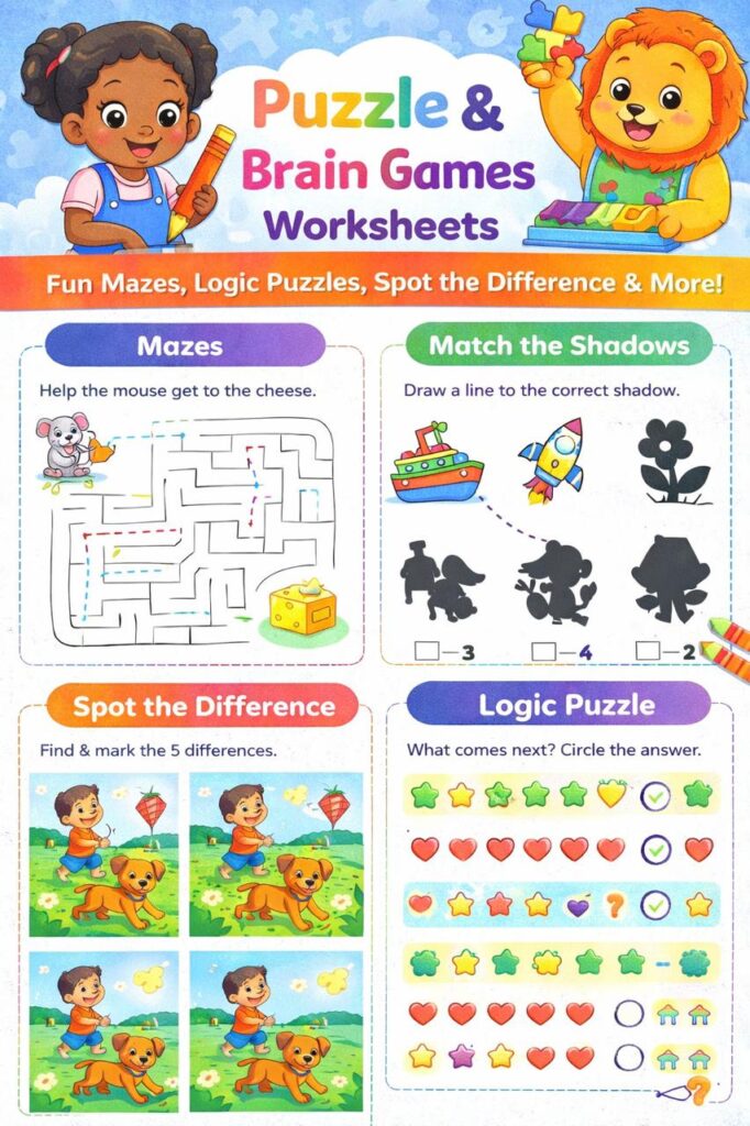 Mazes, puzzles, patterns, logic games, and thinking activities.